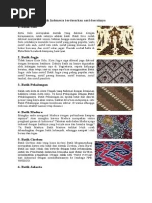 Setiap daerah di indonesia pasti memiliki tarian daerah yang menggambarkan budaya daerah masing. Daun yang dijuluki daun emas tersebut dilukis diatas sehelai kain hingga menampilkan kekhasan tersendiri. Van franquemont meninggal dunia pada 1877, namun produksi batiknya masih tetap. Indonesia memiliki keanekaragaman budaya yang haruslah kita syukuri. Batik adalah warisan turun temurun dari nenek moyang indonesia. Dari ujung barat hingga timur provinsi jawa tengah, semuanya memiliki keunikan dan ciri khas pola. Walaupun sekarang semua daerah sudah mempunyai motif kain batiknya sendiri. Beberapa ciri khasnya adalah 1. Selain batik, jenis kain di antaranya ada songket, tenun, ulos dan beberapa jenis kain langka yang sudah sulit ditemui. daerah lainnya yang juga terkenal akan batiknya adalah madura. Tentunya ada keberagaman bentuk dan motif dari beberapa baju batik yang dimiliki orang tuamu. Mulai mendunia sejak awal orde baru, batik kini memiliki hari peringatannya. Meski begitu, ciri khas batik tersebut tetap mengusung unsur tradisional dan khas.