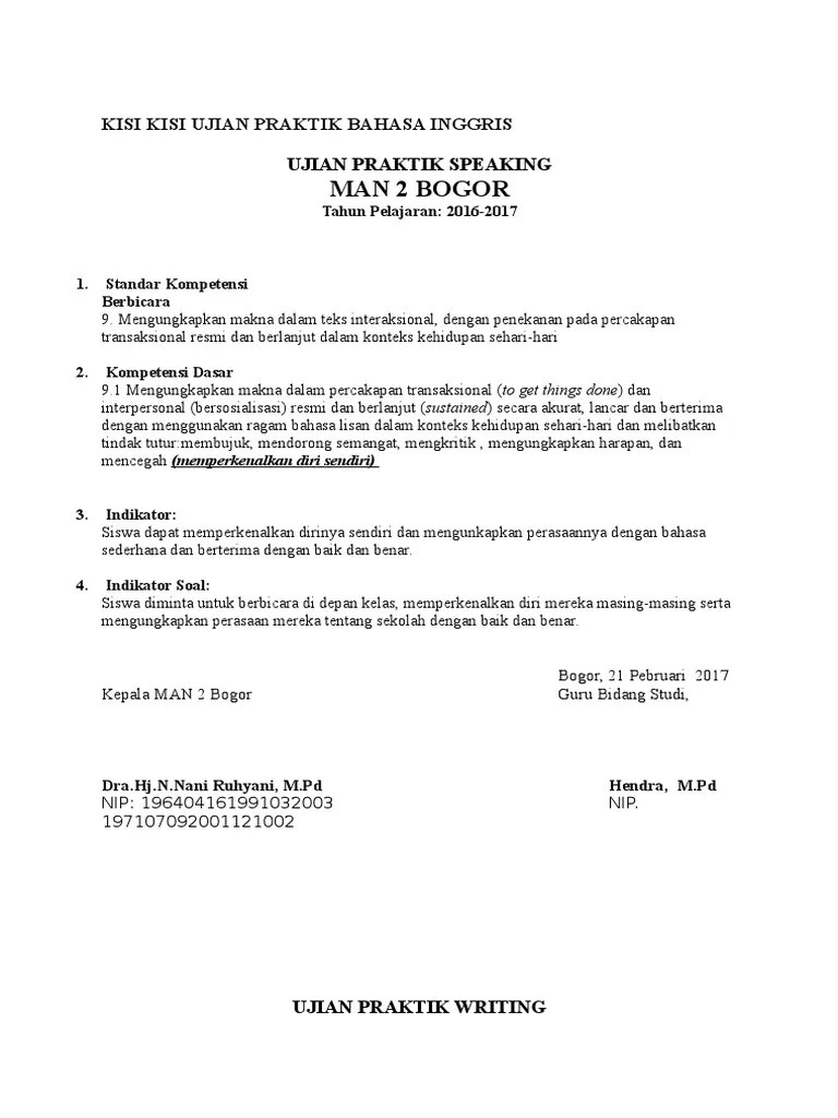 Cek contoh soal ujian praktek bahasa inggris smp kelas 9. Proposal pelaksanaan ujian praktek mata pelajaran bahasa inggris. Kisi kisi ujian praktik semua . Lulusan smp mampu memiliki kompetensi dalam penguasaan bahasa inggris. Contoh soal ujian praktek bahasa indonesia smp berbagi contoh soal from .