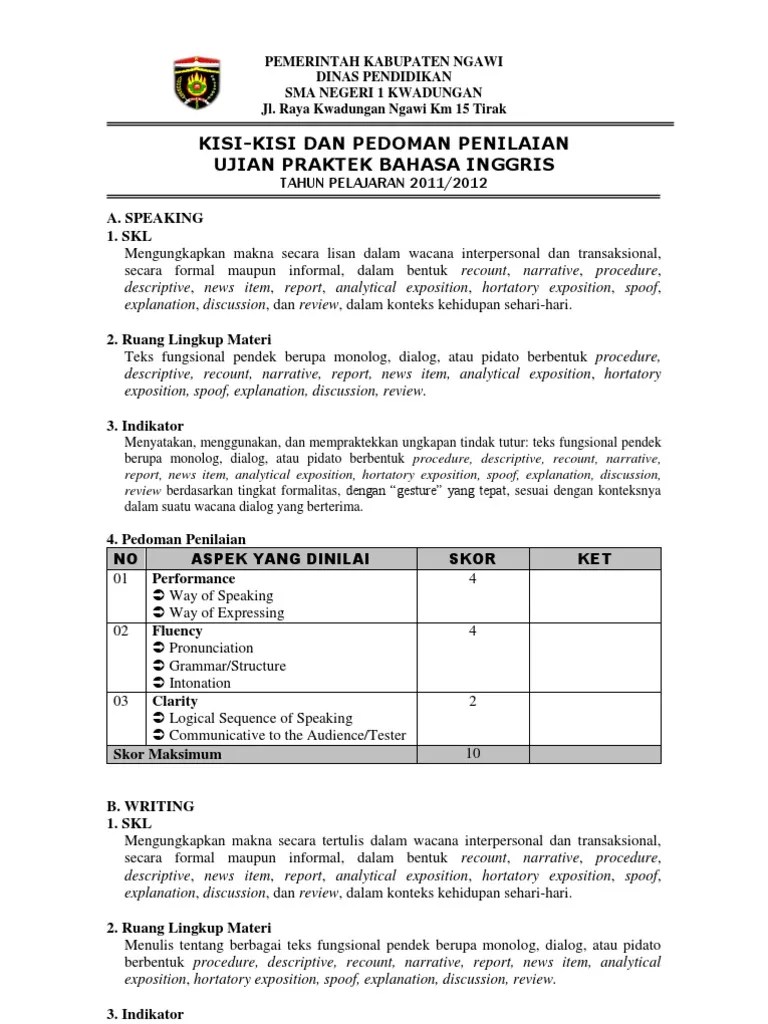 Contoh Kisi Kisi Ujian Praktek Bahasa Inggris Smp / Kisi Kisi Ujian Praktek Semua Mata Pelajaran Di Sd Mi / Petunjuk pelaksanaan ujian praktik usbn jenjang smp kab.